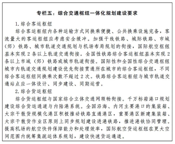 推進綜合交通樞紐一體化規劃建設。推進綜合交通樞紐及郵政快遞樞紐統一規劃、統一設計、統一建設、協同管理。推動新建綜合客運樞紐各種運輸方式集中布局,實現空間共享、立體或同臺換乘,打造全天候、一體化換乘環境。推動既有綜合客運樞紐整合交通設施、共享服務功能空間。加快綜合貨運樞紐多式聯運換裝設施與集疏運體系建設,統籌轉運、口岸、保稅、郵政快遞等功能,提升多式聯運效率與物流綜合服務水平。按照站城一體、產城融合、開放共享原則,做好樞紐發展空間預留、用地功能管控、開發時序協調。